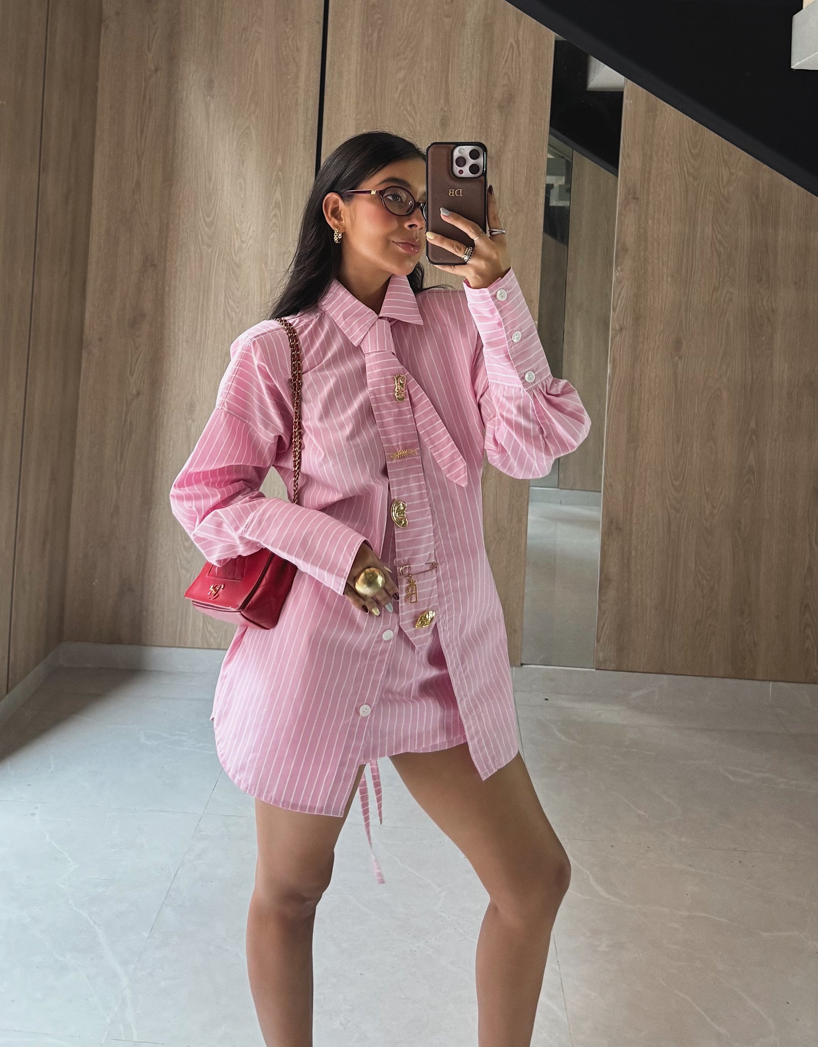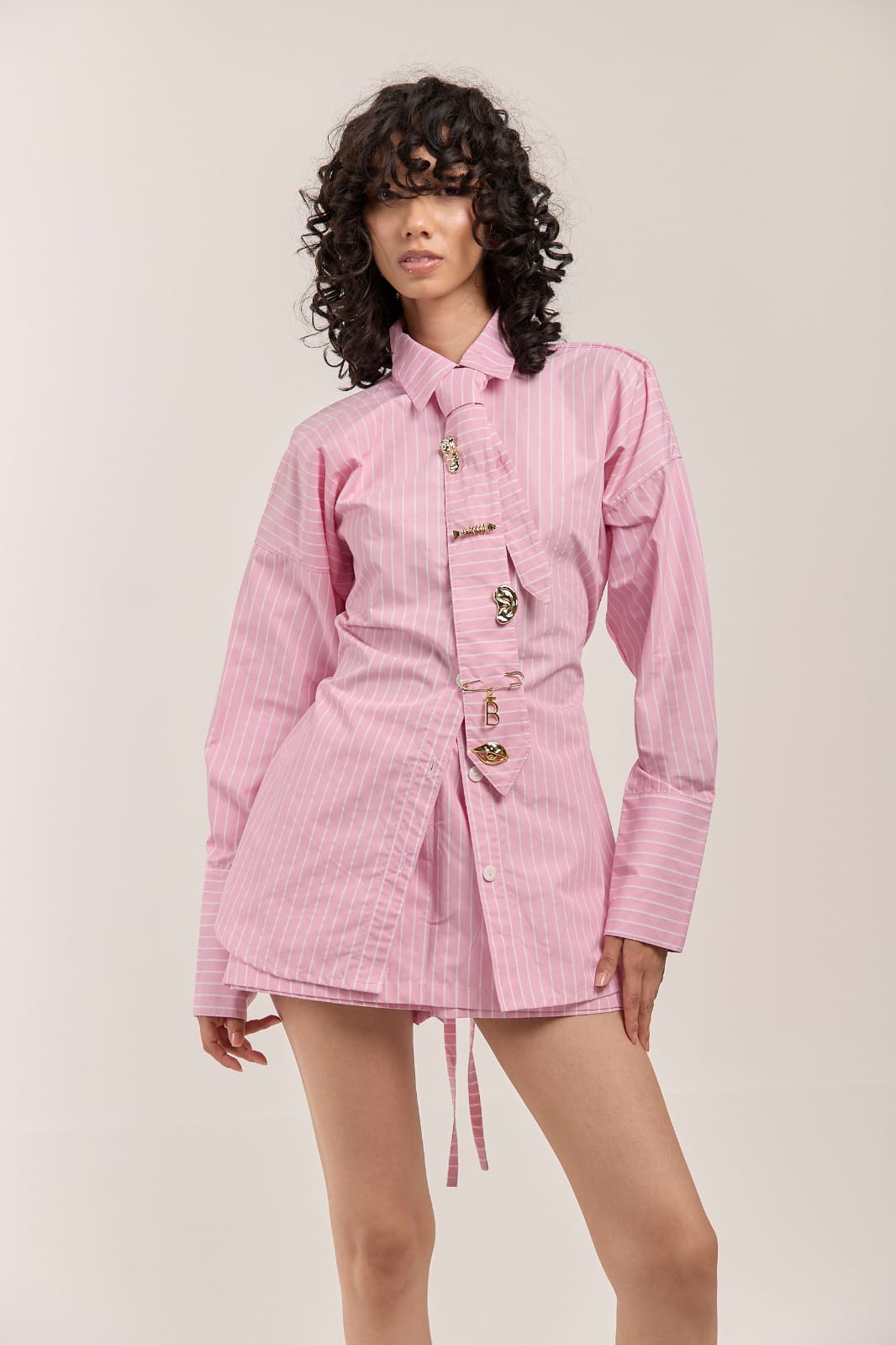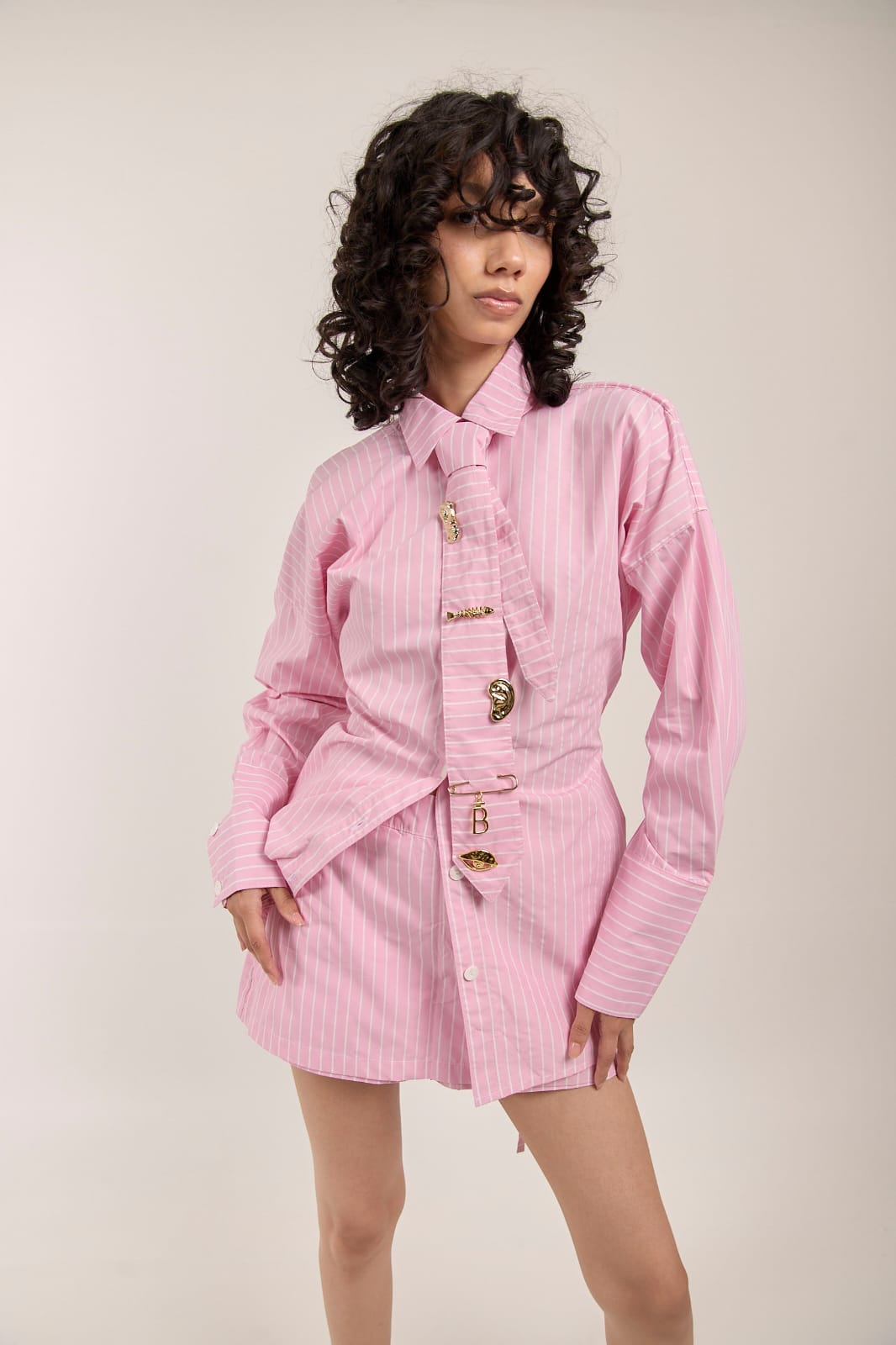El Set Tambor está compuesto por una camisa, una corbata y una falda que, en conjunto, crean un look estructurado y contemporáneo. Cada pieza ha sido pensada al detalle: la espalda ajustable asegura un fit perfecto, mientras los pins en la corbata aportan un toque distintivo que refleja personalidad y carácter.